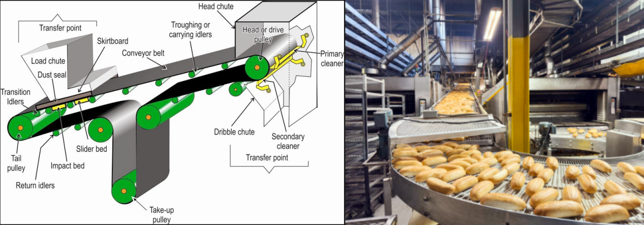 Material carrying and movement: bagged of bread are placed on the moving conveyor belt. Due to the continuous movement of the belt, the bread will move from one position to another with the belt.