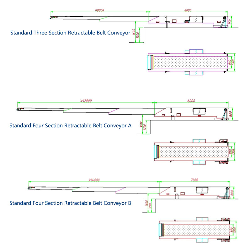 Conveyor sections: two-section, three-section, four-section. Width of conveyor belt: 500, 600, 700, 800, 1000, 1200mm. The telescopic belt conveying speed can be selected: fixed speed or variable speed. The belt conveying direction can be selected: one-way or two-way conveying materials. The belt conveying inclination can be selected: horizontal, fixed inclination or automatic lifting. The base of the fixed section of the conveyor can be selected: fixed or mobile. Conveying speed: <30m/min. Conveyor capacity: <70kg/m.